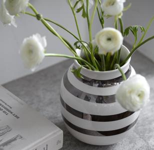 La den lille Omaggio med sølvstriper stå alene eller kombiner den med andre farger og størrelser i Omaggio serien. Kähler vasen fåes i mange farger og kan kombineres med andre pyntegjenstander i hjemmet. Den tidløse vasen passer til all verdens blomster, og er i seg selv veldig.